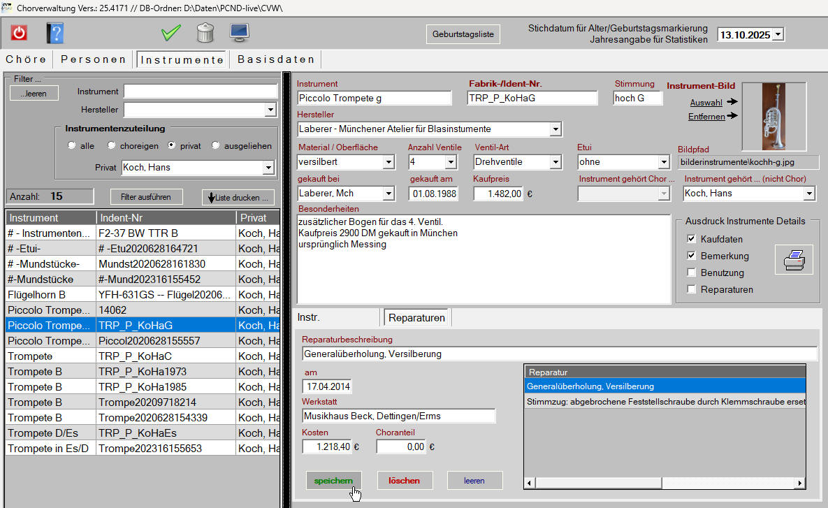 Im Register Reparaturen kann die komplette Reparaturhistorie eines Instruments